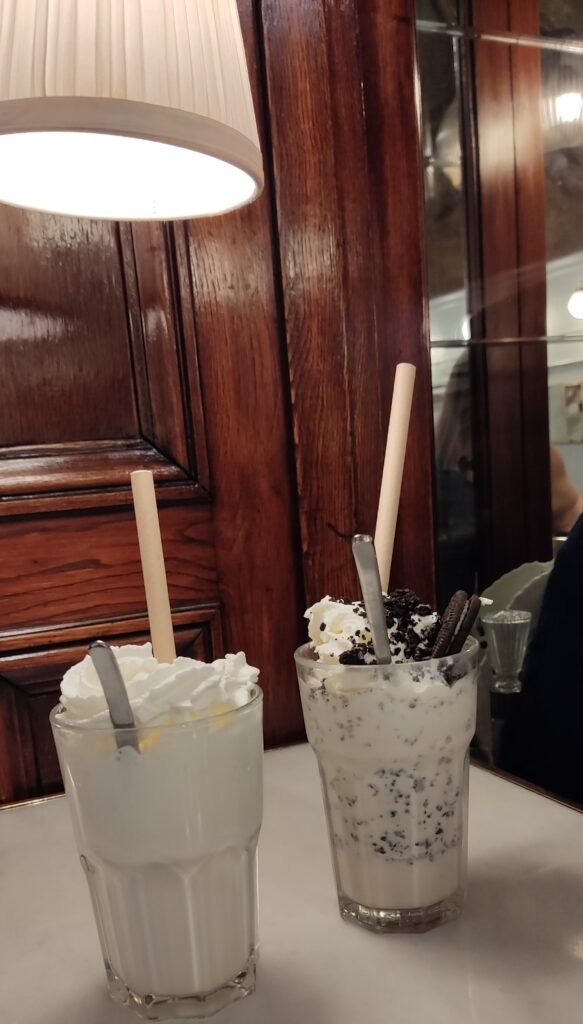 Nos pedimos unos batidos excelentes 🍓🍌 (¡estaban buenísimos!) y vimos que también tenían postres caseros con una pinta increíble. Fue el lugar perfecto para descansar, recargar energías y comentar lo mucho que nos estaba gustando la ciudad.